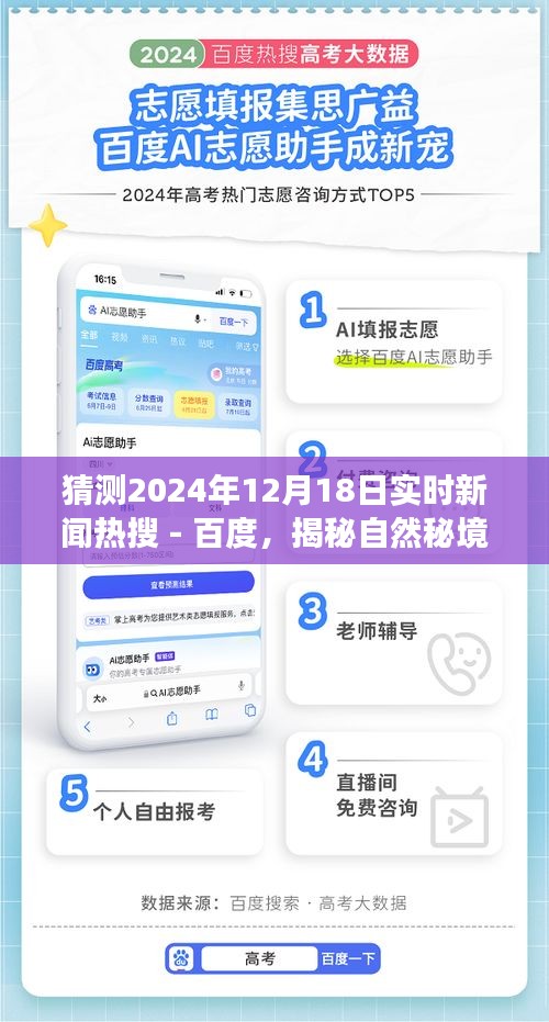 摘要:據(jù)預(yù)測,百度實(shí)時(shí)新聞熱搜將在2024年12月18日聚焦自然秘境的探索之旅。屆時(shí),人們將共同關(guān)注自然美景的奧秘,探尋未來之旅的心靈歸宿。這一天的熱搜將展現(xiàn)對自然環(huán)境的深度探索與發(fā)現(xiàn),同時(shí)揭示人類與自然和諧共生的溫馨港灣。讓我們共同期待這一天的精彩新聞與探索之旅。