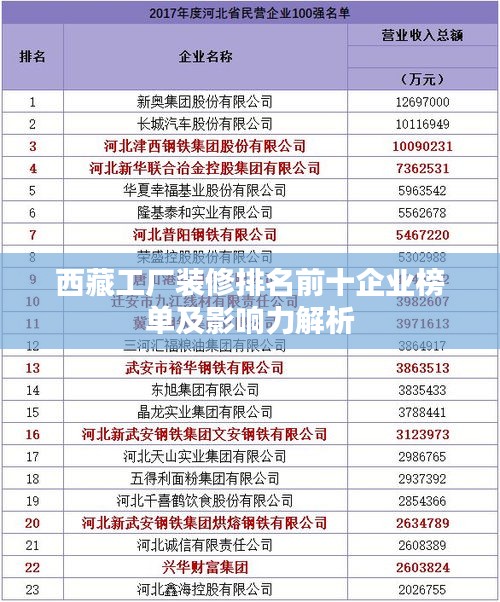 西藏,這片神秘而富有魅力的土地,近年來在經(jīng)濟(jì)建設(shè)的浪潮中逐漸嶄露頭角,工廠裝修作為推動(dòng)地區(qū)工業(yè)發(fā)展的重要一環(huán),也受到了越來越多的關(guān)注,本文將為您揭曉西藏工廠裝修前十名排名,并探討它們的影響力。
